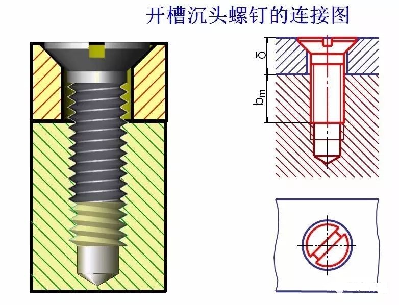 螺釘一般用于受力不大而又不需經常拆卸的地方。被連接零件中的一個加工出螺孔,其余零件都加工出通孔,如圖所示。