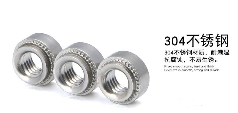 2、壓鉚螺母安裝內螺紋到精密的金屬板材產品上,提供了簡單的方法,起到了可靠的固定作用,小而精巧的螺母,使板材一邊嵌平加工完美,安裝時,只需將螺母插入金屬板的孔中,以壓力完成鑲嵌堅固功能。