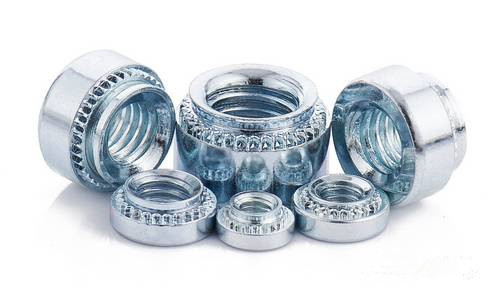 是應用于薄板或鈑金上的一種螺母,外形呈圓形,一端帶有壓花齒及導向槽。其原理是通過壓花齒壓入鈑金的預置孔位,一般而言預置孔的孔徑略小于壓鉚螺母的壓花齒,通過壓力使壓鉚螺母的花齒擠入板內使導致孔的的周邊產生塑性變形,變形物被擠入導向槽,從而產生鎖緊的效果。