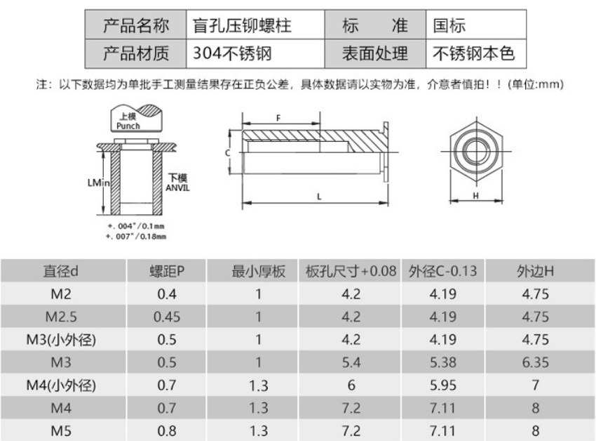 壓鉚螺母柱其外形一端呈六角形,另一端為圓柱狀,六角邊與圓柱狀中間有一道退刀槽,其內形為內螺紋,通過壓力機將六角頭壓入薄板的預置孔內(預置孔的孔徑一般略大于壓鉚螺柱的圓柱外徑)使孔的周邊產生塑性變形,變形部分被擠入壓鉚螺母柱的退刀槽內,使壓鉚螺母柱鉚緊于薄板上,從而在薄板上形成一下有效固定的內螺紋。螺盛盾為了方便大家可以看出其安裝方式方法,采用動畫示意圖展示: